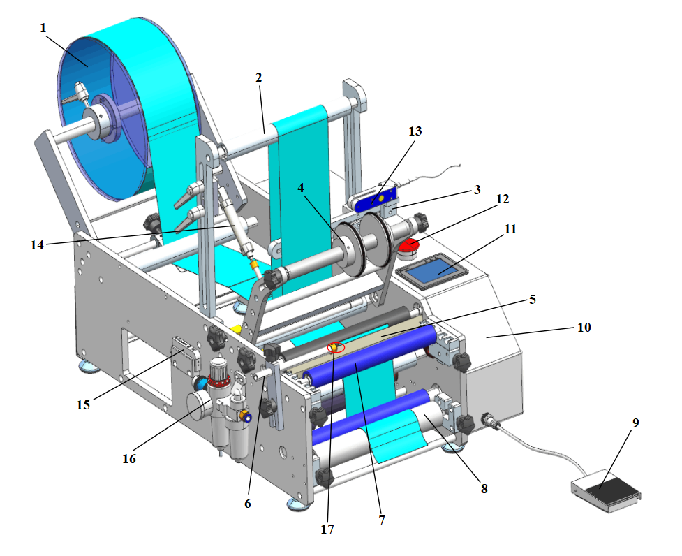 4、壓頂機(jī)構(gòu):用于壓置工件,保證覆標(biāo)效果,可通過(guò)貼標(biāo)機(jī)左側(cè)的旋鈕調(diào)節(jié)松緊度;